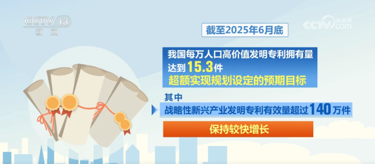 截至2025年6月底,我国每万人口高价值发明专利拥有量达到15.3件,超额实现规划设定的预期目标;其中,战略性新兴产业发明专利有效量超过140万件,保持较快增长。人工智能、先进制造、集成电路、生物医药、新能源等重点领域涌现出一大批原创性、引领性创新成果。
